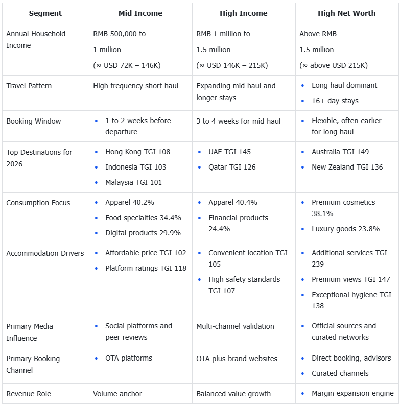 Deric Wong, Chief Business Officer of EternityX, said, “The headline number is significant, but the real story is segmentation. China’s outbound market is no longer one growth curve. It is three demand engines. Short haul volume depends on OTA visibility and peer validation. Mid haul growth requires integrated multi-channel reinforcement. Long haul margin expansion demands credibility and premium service design. This is not a media planning adjustment. It is a revenue architecture shift. In 2026, precision beats scale.”The 2026 Imperative:Short haul volume remains anchored by digitally fluent mid income travellers. Mid haul expansion is driven by high income households. Long haul profitability is underwritten by High Net Worth Individuals.China’s outbound market has matured into a tiered revenue ecosystem. The brands that succeed will treat segmentation not as a marketing tactic, but as a strategic growth framework.