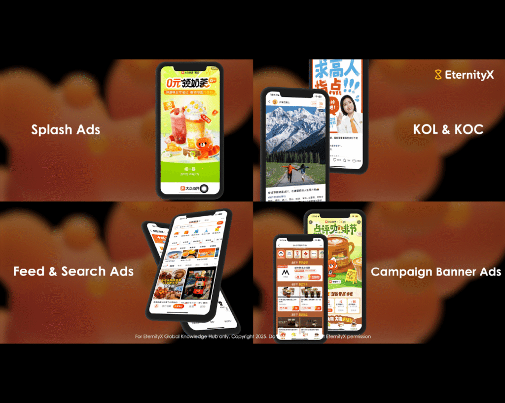 Contact us today — as an official Dianping media reseller, EternityX is your trusted partner for growth in China’s local markets. We provide brands with direct access to Dianping’s advertising ecosystem — supported by strategic planning, creative localization, and performance optimization.